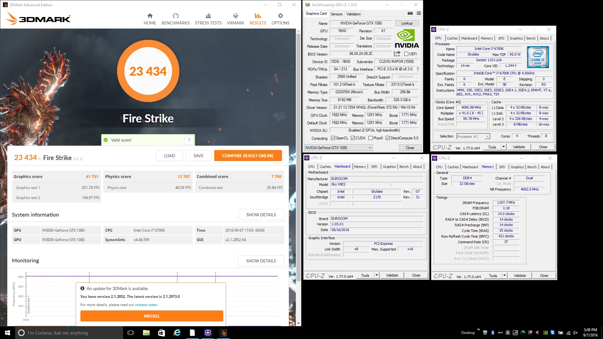 EUROCOM Sky X9E2 3DMark Fire Strike - NVIDIA GeForce GTX 1080 SLI; Score: 23434