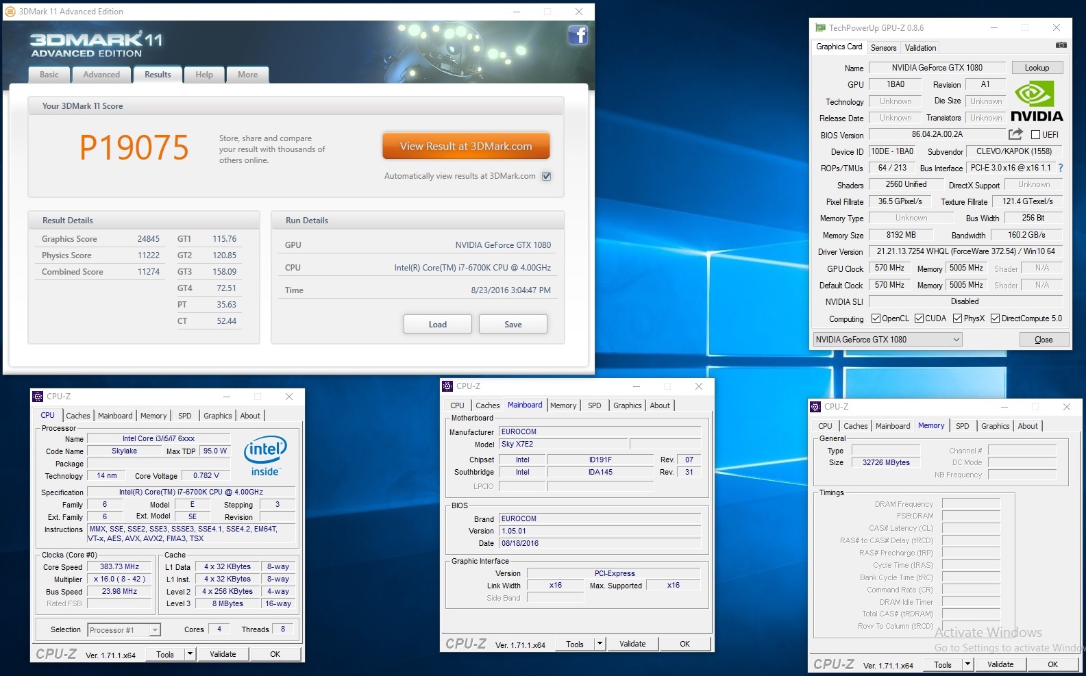 EUROCOM Sky X7E2; 3DMark11; NVIDIA GeForce GTX 1080; Score:P19075