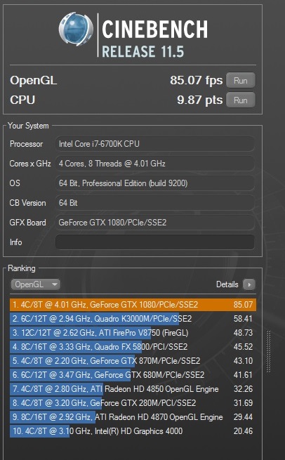 EUROCOM Sky X9E2 - Cinebench - NVIDIA GeForce GTX 1080 SLI (x2) - OpenGL Score: 85.07