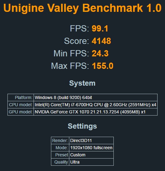 EUROCOM Sky MX5 R2 - NVIDIA GeForce GTX 1070 - Unigine Valley - Score: 4148
