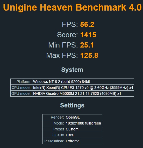 • EUROCOM Tornado F5W - Unigine Heaven 4 - NVIDIA Quadro M5000M - Intel Xeon E3 1270 v5 - Score: 1415
