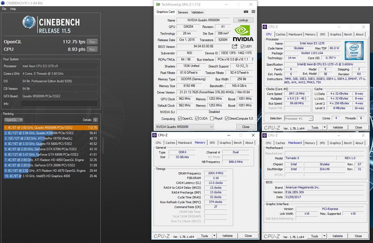• EUROCOM Tornado F5W - Cinebench R11.5 - NVIDIA Quadro M5000M - Intel Xeon E3 1270 v5 - OpenGL: 112.75