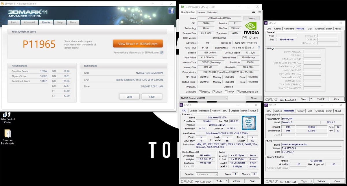 • EUROCOM Tornado F5W - 3DMark11 - NVIDIA Quadro M5000M - Intel Xeon E3 1270 v5 - Score: P11965