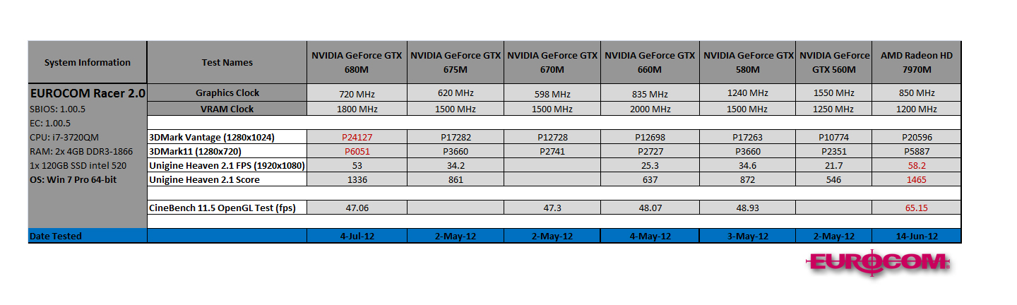 | Graphics EUROCOM Racer 2.0 (HM77) - NVIDIA GTX 660M/670M/675M/580M/560M AMD HD7970M May 10, 2012 Category: Performance |