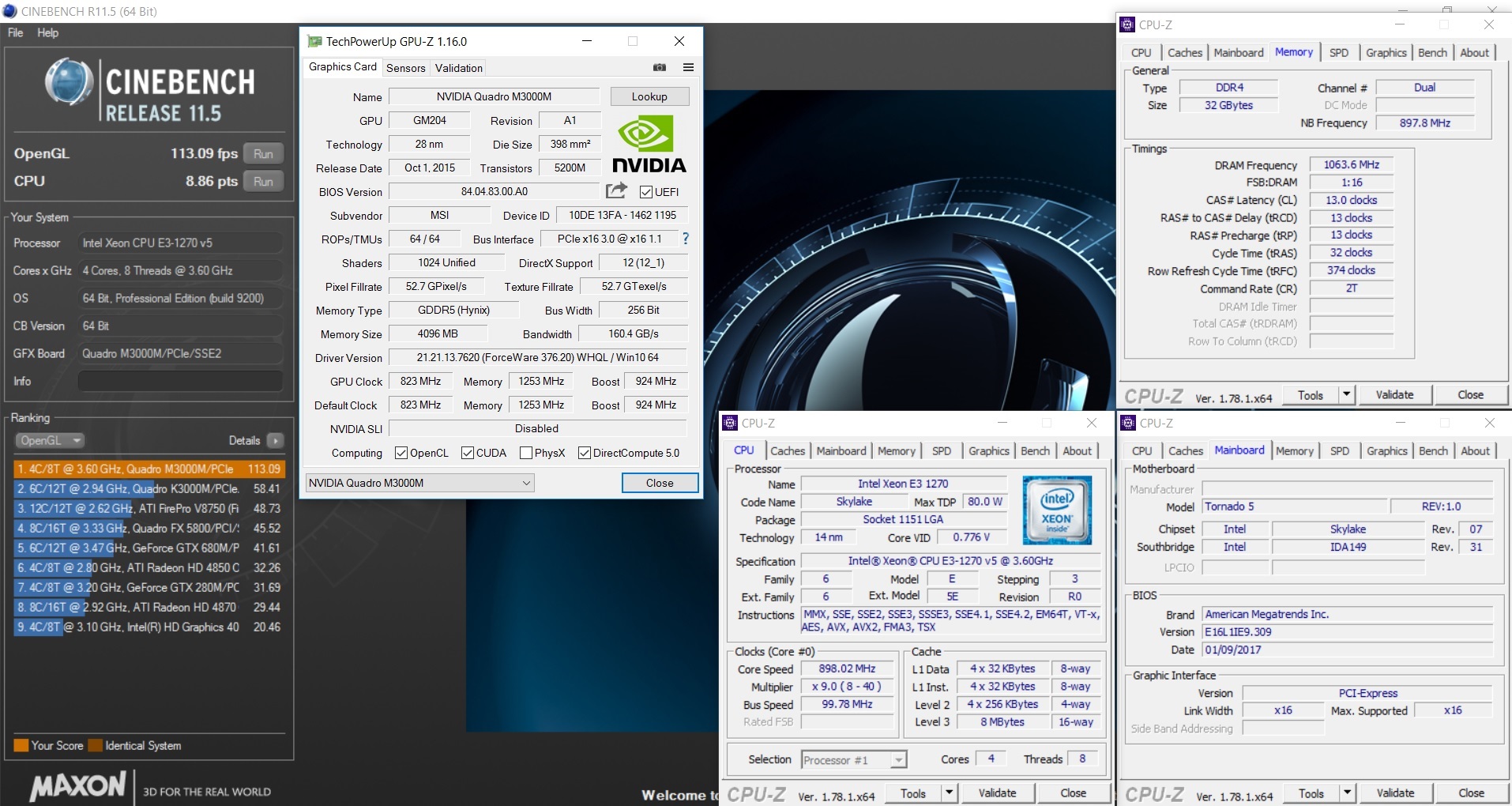 • EUROCOM Tornado F5W - Cinebench R11.5 - NVIDIA Quadro M3000M - Intel Xeon E3 1270 v5 - Score: 113.09
