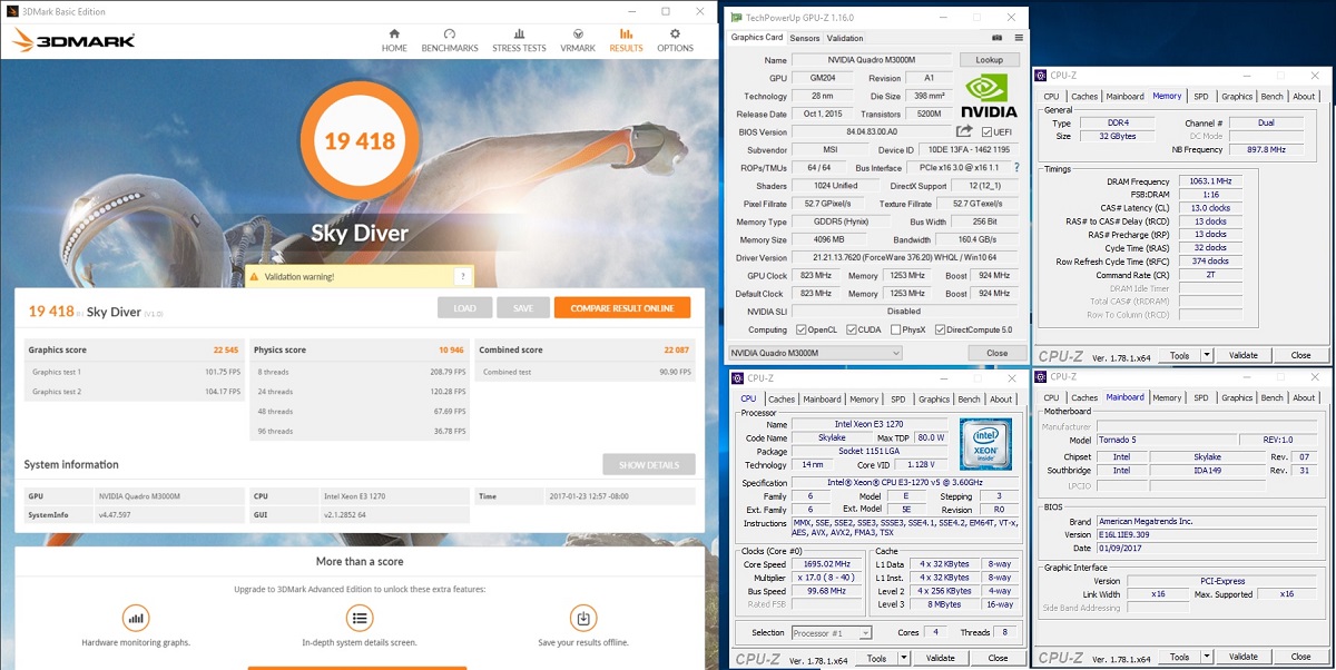 • EUROCOM Tornado F5W - 3DMark Sky Diver - NVIDIA Quadro M3000M - Intel Xeon E3 1270 v5 - Score: 19418
