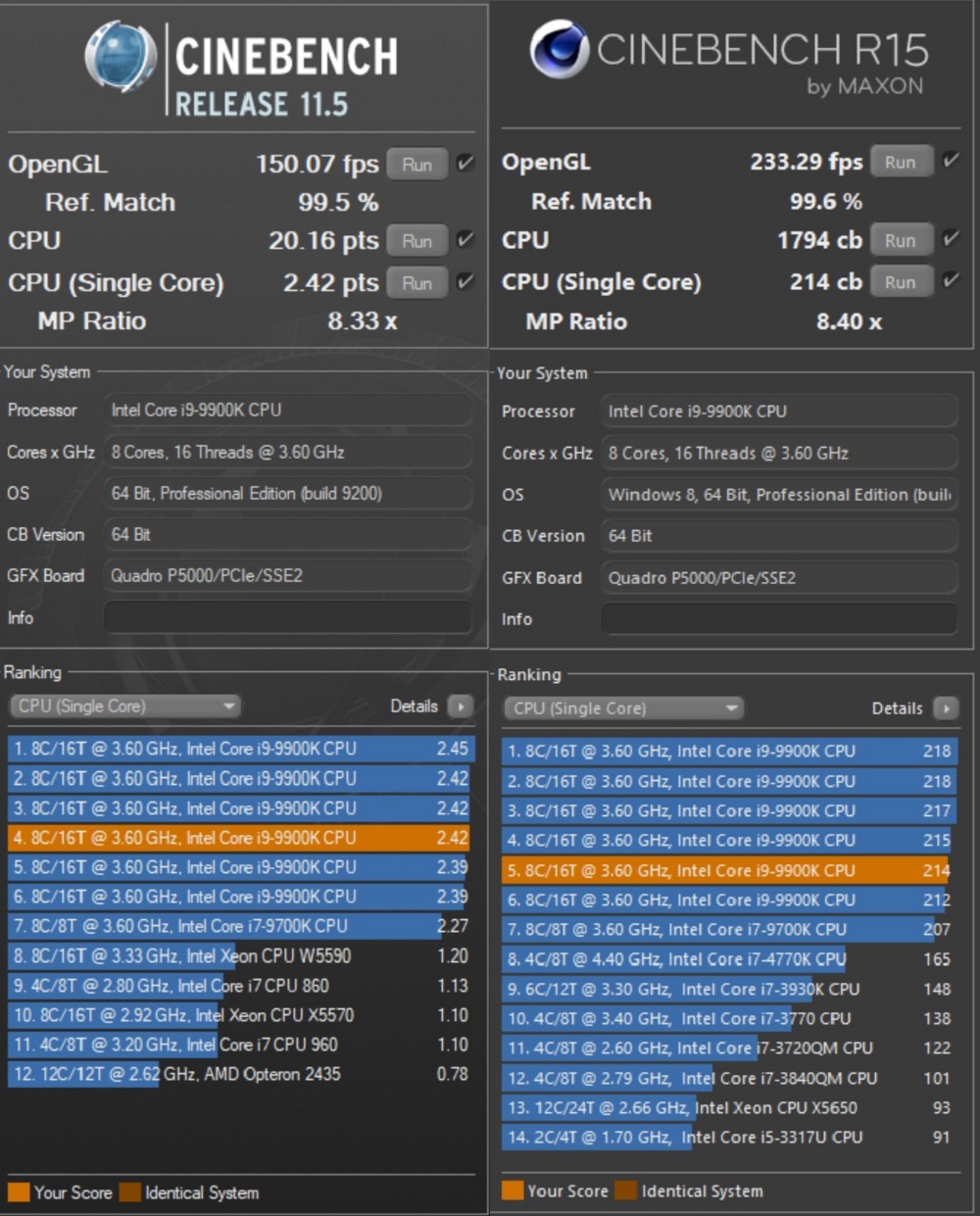 Configuration Tested: Computer: EUROCOM Sky X7C; 17.3in QHD 120Hz CPU: Intel Core i9-9900K (Coffee Lake-S, P0) 3600 MHz (36.00x100.0) @ 898 MHz (9.00x99.8) Motherboard: EUROCOM Sky X7C BIOS: 1.05.13, 09/07/2018 Chipset: Intel Z370 (Kaby Lake) Memory: 65536 MBytes @ 1596 MHz, 20-22-22-42 - 16384 MB PC25600 DDR4 SDRAM - Kingston KHX3200C20S4/16GX - 16384 MB PC25600 DDR4 SDRAM - Kingston KHX3200C20S4/16GX - 16384 MB PC25600 DDR4 SDRAM - Kingston KHX3200C20S4/16GX - 16384 MB PC25600 DDR4 SDRAM - Kingston KHX3200C20S4/16GX Graphics: NVIDIA Quadro P5000 (GP104GL) NVIDIA Quadro P5000, 16384 MB GDDR5 SDRAM Drive: Samsung SSD 970 PRO 512GB, 500.1 GB, NVMe Sound: Intel Kaby Lake - High Definition Audio / cAVS (Audio, Voice, Speech) [A0] Sound: NVIDIA GP104 - High Definition Audio Controller Network: Qualcomm/Atheros E2500 PCI-E Gigabit Ethernet Controller OS: Microsoft Windows 10 Professional (x64) Build 17134.1 (1803/RS4) |