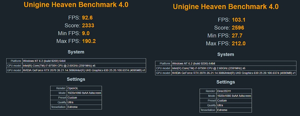 Computer: EUROCOM Nightsky RX17 CPU: Intel Core i7-9750H (Coffee Lake-H, U0) 2600 MHz (26.00x100.0) @ 3991 MHz (40.00x99.8) Motherboard: Eurocom Nightsky RX17 BIOS: 1.07.11TEU1, 02/01/2019 Chipset: Intel HM370 (Cannon Lake-H) Memory: 16384 MBytes @ 1330 MHz, 18-18-18-43 - 16384 MB PC24000 DDR4 SDRAM - Corsair CMSX32GX4M2A3000C1 Graphics: Intel UHD Graphics 630 (Coffee Lake-H GT2) - Integrated Graphics Controller Intel UHD Graphics 630, 1024 MB Graphics: NVIDIA GeForce RTX 2070 (TU106M) NVIDIA GeForce RTX 2070, 8192 MB GDDR6 SDRAM Drive: Samsung SSD 970 PRO 512GB, 500.1 GB, NVMe Sound: Intel Cannon Lake-H/S - cAVS (Audio, Voice, Speech) [B0] Sound: NVIDIA TU106 - High Definition Audio Controller Network: Intel Cannon Lake-H/S - CNVi: WiFi (sku 0) [B0] Network: RealTek Semiconductor RTL8168/8111 PCI-E Gigabit Ethernet NIC OS: Microsoft Windows 10 Professional (x64) Build 17763.253 (1809/RS5) |