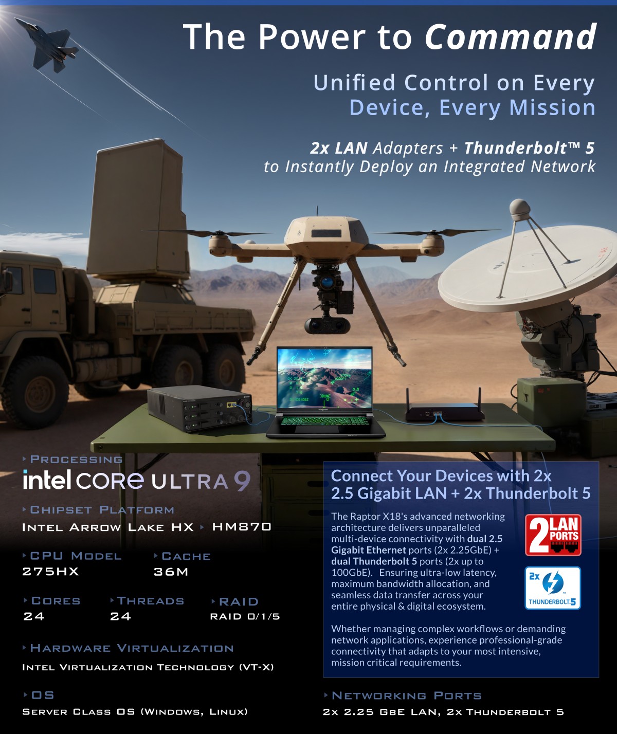 Perfect for professionals who need enterprise-level networking capabilities - or military grade GPU compute - in dynamic environments, the Raptor X18's versatile port configuration accommodates complex networking topologies while maintaining exceptional performance for your most demanding, time-sensitive operations.