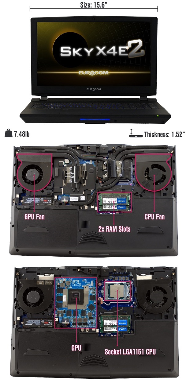 Oct 05, 2016 Eurocom launches fully upgradeable 15.6” Sky X4E2 high performance laptop with LGA 1151 socket, Z170 Chipset, Intel Core i7 6700K, NVIDIA GeForce GTX 10 series MXM 3.0 graphics, 64 GB DDR4 memory, 4k Contact: Braden Taylor 613-656-7961 btaylor@eurocom.com Eurocom launches the 15.6” Sky X4E2 fully upgradeable, high performance laptop with NVIDIA GeForce GTX 1070 or 1060 MXM graphics, powerful Skylake Intel Core i7-6700K Desktop Processor, up to 64GB of DDR4 3000MHz memory and up to 6TB of RAID 0/1 storage with four drives including two NVMe based M.2 SSDs. EUROCOM Sky X4E2 packs more power than most desktops into a 15.6-inch laptop form factor. This understated 7.5lbs NVIDIA VR Ready beast will go toe-to-toe with any laptop foolish enough to look it in the eye! The EUROCOM Sky X4E2 is designed as a high performance, highly mobile powerhouse platform that is fully upgradeable and configurable with a rock solid chassis for on the go use for students, gamers or professionals. Have reliable internet on the go with the prewired 3G/4G/LTE module support in the Sky X4E2. Equipped with a fully unlocked LGA1151 socket based Intel i7 6700K or 6600K Skylake Processor, users won’t have any trouble running demanding games, simulations and intense workloads with this pocket rocket! Armed with your choice of modular and upgradeable MXM 3.0 NVIDIA GeForce GTX 1060 or 1070 desktop graphics cards, users will be able to perform heavy-duty rendering and run the latest games on high settings. Graphics NVIDIA GeForce 10 series MXM 3 graphics are supported in the Sky X4E2 for high performance graphics capability in a 15.6” chassis. - 6GB GDDR5; NVIDIA GeForce GTX 1060 (desktop); 1280 CUDA; N17E-G1; MXM 3.0 - 8GB GDDR5; NVIDIA GeForce GTX 1070 (desktop); 2048 CUDA; N17E-G2; MXM 3.0 Processor When equipped with the quad core Intel Core i7-6700K unlocked processor, via LGA 1151 socket and Intel Z170 chipset integration, running at up to 4.2 GHz with 8MB of SmartCache, the Sky X4E2 delivers class-leading multi-tasking and multi-threaded performance. - 4GHz (up to 4.2GHz) Intel Core i7-6700K; 4C/8T; 8MB L3; Skylake-S; 14nm; LGA1151; 91W - 3.5GHz (up to 3.9GHz) Intel Core i5-6600K; 4C/4T; 6MB L3; Skylake-S; 14nm; LGA1151; 91W - 3.4GHz (up to 4GHz) Intel Core i7-6700; 4C/8T; 8MB L3; Skylake-S; 14nm; LGA1151; 65W - 2.8GHz (up to 3.6GHz) Intel Core i7-6700T; 4C/8T; 8MB L3; Skylake-S; 14nm; LGA1151; 35W Overclocking center The EUROCOM Sky X4E2, like all new Eurocom systems, is equipped with a user friendly Overclocking Center to get the most out of your high performance laptop by modifying the Core and Memory increment for the GPU and CPU ratio override, cache Ratio and power limits. Intel XTU (Extreme Tuning Utility) support is enabled on the Sky X4E2 platform, allowing enthusiasts to push the limits of their hardware. XTU allows users to adjust CPU and system clocks, as well as monitor the system for stability. Unlocked CPUs such as the i7-6700k can be overclocked through multiplier adjustment. Display Despite this little guy’s form factor, we haven’t compromised on your choice of 15.6-inch, IPS display options. You can choose from a FullHD, G-SYNC panel or an UltraHD 4K display for your preferences. Memory The Sky X4E2 has four 260pin SODIMM 1.2V memory slots and supports up to 64GB DDR4 3000MHz, creating a flexible tool for virtualization, gaming and high performance computing. Users have a wide selection of memory options, starting from 8 GB all the way up to 64 GB of DDR4 RAM! Storage In the storage department, we offer room for up to 4 physical storage drives (two M.2 slots and two 2.5 inch bays), for a maximum storage capacity of up to 6 TB! Security Further, your data will be protected with a Kensington lock, biometric security, and Trusted Platform Module (TPM) data encryption. TPM encrypts all your data so only you have access to it, even if your machine is misplaced or stolen. Ports 2 x USB 3.1 Type C (Thunderbolt 3) 3 x USB 3.0 (1x powered, AC/DC) 1 x USB 2.0 2 x mini DisplayPort 1.3 1 x HDMI 2.0 output 1 x 2-in-1 Audio Jack (Headphone / S/PDIF) 1 x Microphone-in 1 x Line-out 1 x Line-in 1 x RJ-45 LAN 1 x DC-in About Eurocom: Eurocom is the leading developer of long lifespan, fully upgradeable notebooks, as well as, high performance mobile workstations and servers since 1989. Eurocom prides itself as an Industry leader in providing ground breaking technology and continues to engineer innovative solutions that inspire individuals and companies to new growth and development. For more information on Eurocom please visit us at www.eurocom.com |
