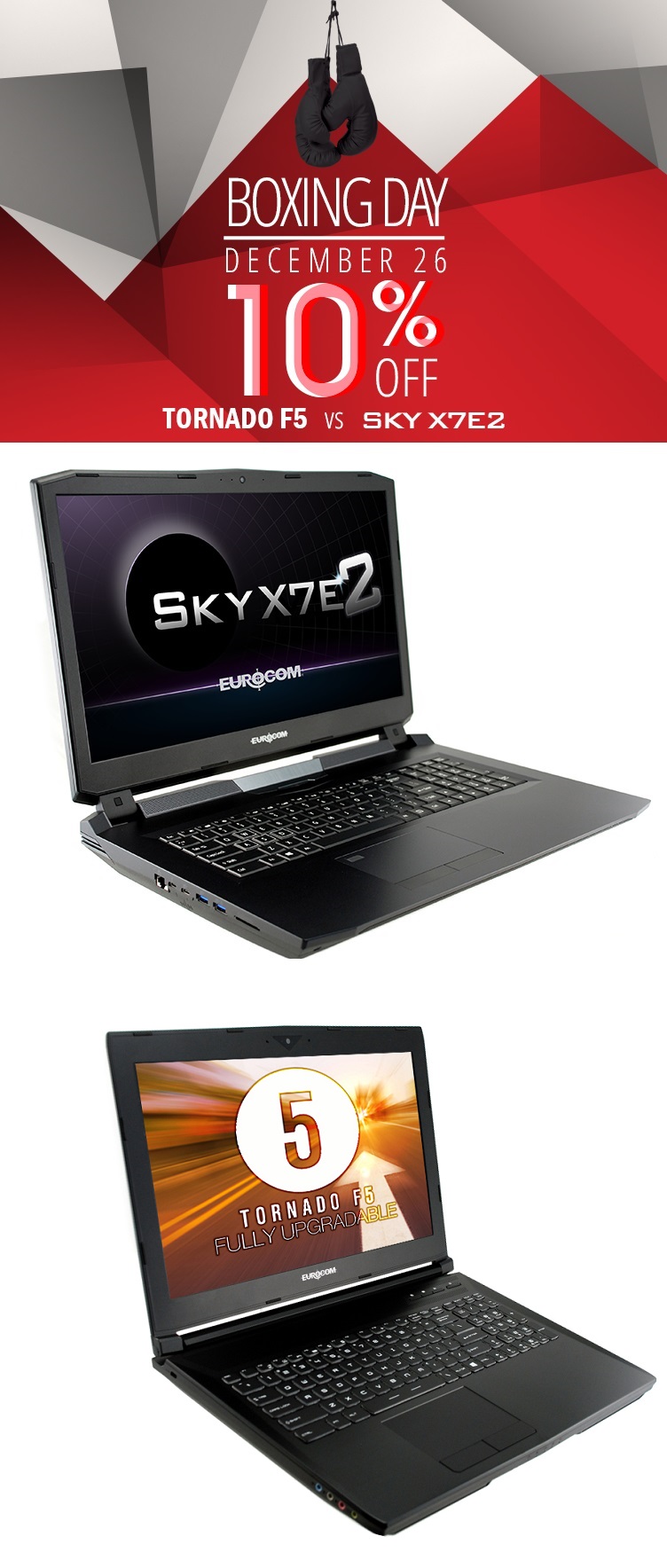 Dec 26, 2016 Eurocom launches Boxing Day sale on the Tornado F5 and Sky X7E2 with NVIDIA GeForce GTX 10 series graphics, Intel Core i7 6700K, processors, 64 GB Memory and super-fast M.2 PCIe storage Contact: Braden Taylor 613-656-7961 btaylor@eurocom.com Eurocom gives presents to customers with epic Boxing Day sale! Eurocom is playing the role of Santa Claus this Christmas by discounting the epic Sky X7E2 and Tornado F5 this Boxing Day. Eurocom is offering a 10% discount on the high performance Sky X7E2 and Tornado F5 laptops on Boxing Day. EUROCOM Sky X7E2 EUROCOM Tornado F5 Eurocom wants to continue the long tradition of Boxing Day, which is a Holiday Celebrated the day after Christmas, typically in Commonwealth Nations that occurs on December 26. Beginning in the 1800s, Boxing Day was observed as a day in which post men, errand boys and servants could expect to receive a Christmas Box as a thanks for good service throughout the previous year. At, Eurocom we would like to observe this tradition by assisting our fans from around the world to acquire the Tornado F5 or X7E2 high performance laptops to reward themselves, their loves ones or friends. The Tornado F5 and X7E2 are fully upgradeable and customizable allowing customers to build the laptop of their dreams. Choosing the processor, graphics card, memory, storage, display and wireless card allows users to build a system that is perfect for their requirements without the need to purchase unwanted components. EUROCOM Sky X7E2 The EUROCOM Sky X7E2 is equipped with one MXM 3 slot rated at up to 190 W that is able to support NVIDIA GeForce GTX 1080 (8 GB GDDR5X) or 1070 (8 GB GDDR5X) Pascal Graphics. The Sky X7E2 was designed from the beginning as a no-compromise gaming platform, so there are no bottlenecks from hybrid graphics switching solutions such as Optimus or Enduro, just raw performance. EUROCOM Sky X7E2 is a full size notebook that supports four 260-pin DDR4 SODIMM up to 64GB, up to four internal drives including two M.2 SSD’s all of which support RAID 0/1, or GTX 1080 or1070 running up to 190W per card. It offers easy access to internal components to allow future upgradeability by the user. The Intel Z170 Express platform enables the Sky X7E2 to provide users with the tools needed to redefine the limits of mobile performance with such features as support for Intel Core i7 6700K processors, dual SATA 6Gbp/s connections, five USB 3.0 ports, SSD caching technologies and full XTU overclocking support with unlocked CPUs and overclockable Pascal graphics. EUROCOM Tornado F5 Fully upgradeable, fully customizable, users can turn the EUROCOM Tornado F5 into the laptop of their dreams by selecting the components they want to fit inside this highly capable, yet very mobile chassis. EUROCOM Tornado F5 is designed to get the job done – take it to your worksite or office, the Tornado F5 is along for the ride of your life. The EUROCOM Tornado F5 couples NVIDIA GeForce GTX 1070 graphics, Intel Core i7 6700K processor, 64 GB memory all in a 15.6” chassis for mind blowing performance in a highly mobile chassis. Being fully upgradeable the EUROCOM Tornado F5 can support a variety of MXM 3.0b graphics cards including next generation NVIDIA GeForce GTX 1070, 1060 graphics, NVIDIA GeForce GTX 980M, 970M, 965M as well as professional grade NVIDIA Quadro M5000M, M3000M and M1100M graphics. Utilizing an Intel Z170 Chipset and LGA1151 socket gives the EUROCOM Tornado F5 the ability to support up to the Intel Core i7 6700k processor managing up to 64 GB DDR4 memory. Four drives are supported for up to 6 TB of storage support with two M.2 SSDs and two HDD/SSD. EUROCOM Sky X7E2 Specifications: • Display: 17.3-inch; FHD (2K) 1920x1080; QHD (3K) 2560x1440 or UltraHD (4K) 3840x2160 • Chipset: Intel Z170 Express (Skylake) • Processor: socketed desktop LGA1151 CPU, up to Intel i7-6700K, fully unlocked • Memory: up to 64GB; DDR4-3000; 4 SODIMM sockets • VGA Technology: NVIDIA GeForce: GTX 1080 (8GB GDDR5X) or 1070 (8GB GDDR5); one MXM 3.0 slot; up to 190W • Display Technology: supports 4 external monitors via 2x DP 1.3, 1x HDMI 2.0 and 1x HDMI 2.0 or DP1.2 (via USB 3.1 type C port); Nvidia Surround View • Storage: up to 5TB with 4 drives; 2x HDD/SSD (SATA3) + 2x M.2 PCIe Gen3 x4/SATA3; RAID 0/1/5/10; supports NVMe SSDs • Communications: 1Gb LAN RJ-45 port Killer E2400 + M.2 WLAN/Bluetooth • Operating Systems: Microsoft Windows: 10, 8.1 and 7 • Card Reader: 6-in-1 MMC/RSMMC/SD/miniSD/SDHC/SDXC up to UHS-II • Keyboard: Illuminated, backlit with customizable 7-colours • Security: TPM 2.0, Fingerprint and Kensington Lock • Audio System: Sound Blaster X-Fi MB5; external 7.1CH audio output; headphone out, microphone in, S/PDIF and Line-in port; two built-in ONKYO Speakers (2.2W)+ Subwoofer (2.5W) • Ports: 2x USB 3.1 type C (HDMI 2.0/DP 1.2/Thunderbolt 3); 2x miniDP 1.3; 1x HDMI 2.0; 3x USB 3.0 ; 1x USB 3.0 (Powered USB, AC/DC); S/PDIF; Headphone; Mic; Line-in; RJ45 (LAN) • Weight and dimensions: 3.9kg / 8.58lb; WxDxH 418x295x39.9mm / 16.72x11.81x1.6-inch EUROCOM Tornado F5 Specifications: • 15.6-inch FHD 1920-by-1080 pixels or 4K UltraHD 3840-by-2160 pixels; eDP Fully upgradeable, fully customizable - a True Workhorse Turn the EUROCOM Tornado F5 into the laptop of your dreams by selecting the components you want to fit inside this highly capable, yet very mobile chassis. • Chassis: Aluminium Alloy (Back Cover and Top Case) and German manufactured resins (Front Cover and Bottom Case) • Chipset: High Performance Intel Z170 Express Chipset • Processor: Socket based; LGA1151; up to 91W TDP; choice of Core i7, i5, i3 up to 6700K. �� VGA Technology: upgradeable MXM 3.0; NVIDIA GeForce: GTX 1070, 1060, 980M, 970M or 965M; Quadro: M1000M, M3000M, M4000M or M5000M; up to 120W TDP; discrete GPU only (no Optimus) • Memory: Four 260-pin SODIMM sockets; DDR4-2133/2400; up to 64GB • Storage: up to 3 physical drives: 2x M.2 2280 PC