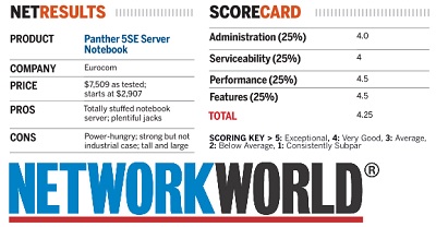 The Eurocom Panther 5SE notebook server has good looks, and more importantly: very serious power for its form-factor. It's vastly heavier than a typical notebook but has the guts of a hefty 1U, NOC-grade server inside. It can be backpacked,