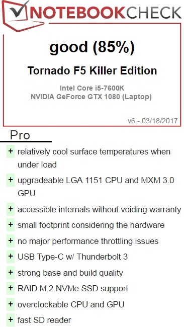 Verdict The Tornado F5 should be commended for incorporating an accessible LGA 1151 socket and MXM 3.0 slot onto a 15-inch chassis that is smaller and even lighter than many popular and less powerful alternatives. From this perspective, the system is not unlike the Razer Blade Pro - larger-than-life hardware in as compact of a chassis as possible. The fact that we can record no major throttling issues or hidden cut corners that directly affect performance is another notable accomplishment.