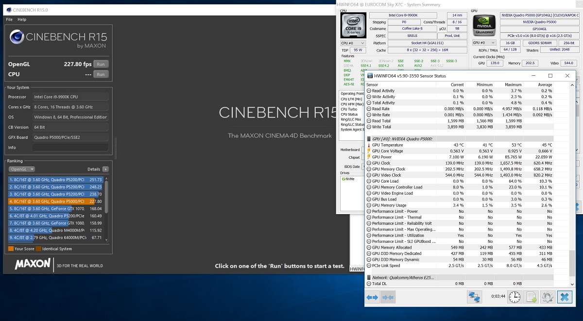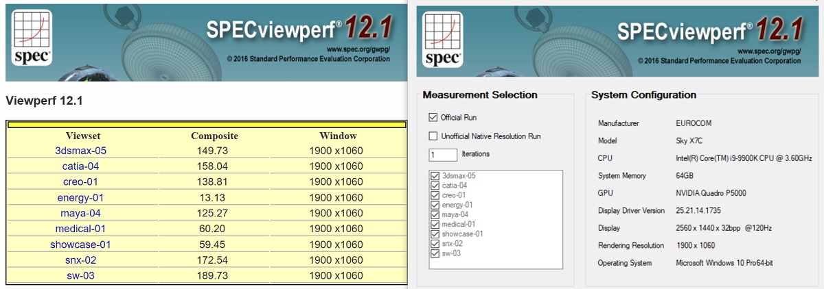 Configuration Tested: Computer: EUROCOM Sky X7C; 17.3in QHD 120Hz CPU: Intel Core i9-9900K (Coffee Lake-S, P0) 3600 MHz (36.00x100.0) @ 898 MHz (9.00x99.8) Motherboard: EUROCOM Sky X7C BIOS: 1.05.13, 09/07/2018 Chipset: Intel Z370 (Kaby Lake) Memory: 65536 MBytes @ 1596 MHz, 20-22-22-42 - 16384 MB PC25600 DDR4 SDRAM - Kingston KHX3200C20S4/16GX - 16384 MB PC25600 DDR4 SDRAM - Kingston KHX3200C20S4/16GX - 16384 MB PC25600 DDR4 SDRAM - Kingston KHX3200C20S4/16GX - 16384 MB PC25600 DDR4 SDRAM - Kingston KHX3200C20S4/16GX Graphics: NVIDIA Quadro P5000 (GP104GL) NVIDIA Quadro P5000, 16384 MB GDDR5 SDRAM Drive: Samsung SSD 970 PRO 512GB, 500.1 GB, NVMe Sound: Intel Kaby Lake - High Definition Audio / cAVS (Audio, Voice, Speech) [A0] Sound: NVIDIA GP104 - High Definition Audio Controller Network: Qualcomm/Atheros E2500 PCI-E Gigabit Ethernet Controller OS: Microsoft Windows 10 Professional (x64) Build 17134.1 (1803/RS4) |