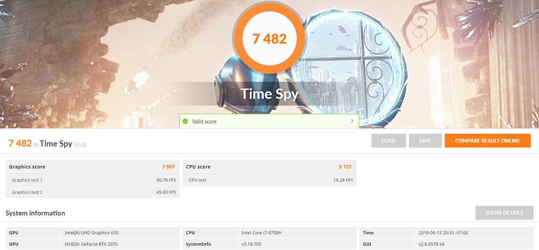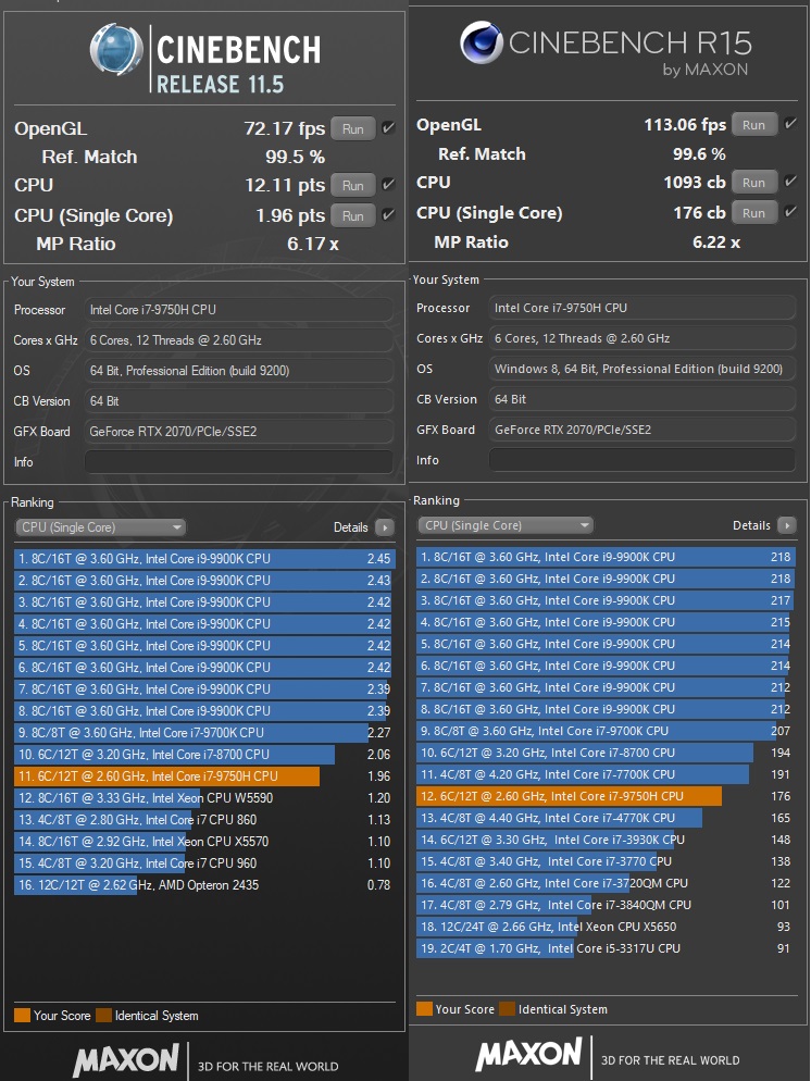 Computer: EUROCOM Nightsky RX17 CPU: Intel Core i7-9750H (Coffee Lake-H, U0) 2600 MHz (26.00x100.0) @ 3991 MHz (40.00x99.8) Motherboard: Eurocom Nightsky RX17 BIOS: 1.07.11TEU1, 02/01/2019 Chipset: Intel HM370 (Cannon Lake-H) Memory: 16384 MBytes @ 1330 MHz, 18-18-18-43 - 16384 MB PC24000 DDR4 SDRAM - Corsair CMSX32GX4M2A3000C1 Graphics: Intel UHD Graphics 630 (Coffee Lake-H GT2) - Integrated Graphics Controller Intel UHD Graphics 630, 1024 MB Graphics: NVIDIA GeForce RTX 2070 (TU106M) NVIDIA GeForce RTX 2070, 8192 MB GDDR6 SDRAM Drive: Samsung SSD 970 PRO 512GB, 500.1 GB, NVMe Sound: Intel Cannon Lake-H/S - cAVS (Audio, Voice, Speech) [B0] Sound: NVIDIA TU106 - High Definition Audio Controller Network: Intel Cannon Lake-H/S - CNVi: WiFi (sku 0) [B0] Network: RealTek Semiconductor RTL8168/8111 PCI-E Gigabit Ethernet NIC OS: Microsoft Windows 10 Professional (x64) Build 17763.253 (1809/RS5) |