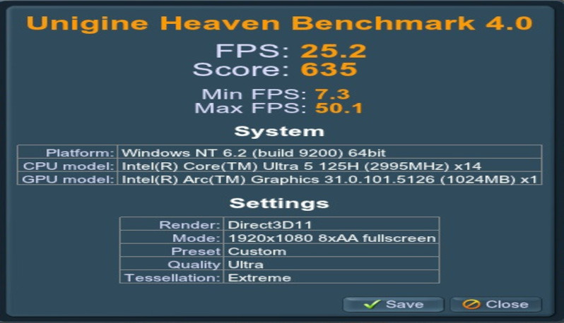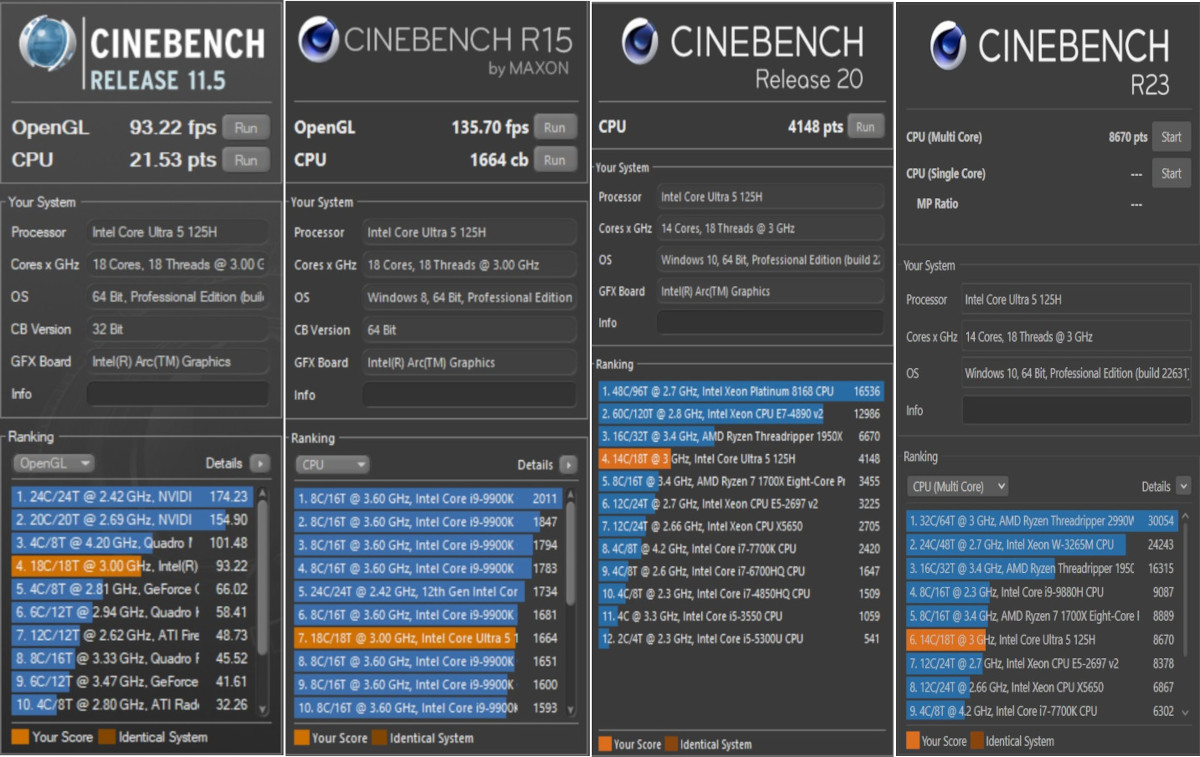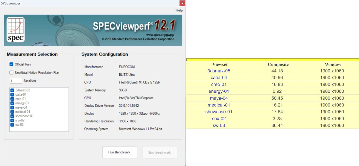 Computer: EUROCOM BLITZ Ultra 14" CPU: Intel Core Ultra 5 125H (Meteor Lake-H, C0) 3000 MHz (30.00x100.0) @ 1995 MHz (20.00x99.8) Motherboard: EUROCOM V5x0TU_Blitz BIOS: 1.07.07eu, 07/04/2024 Chipset: Intel Meteor Lake-H PCH Memory: 98304 MBytes @ 2793 MHz, 46-45-45-90 - 49152 MB PC44800 DDR5 SDRAM - Crucial Technology CT48G56C46S5.M16B1 - 49152 MB PC44800 DDR5 SDRAM - Crucial Technology CT48G56C46S5.M16B1 Graphics: Intel Meteor Lake-P - Integrated Graphics [CLEVO/KAPOK COMPUTER] Intel Arc Graphics, 2097148 KB Graphics: Intel Meteor Lake-U/H NPU - Neural Processing Unit (Movidius VPU3720) Intel NPU, 0 MB Drive: Corsair MP700 PRO, 976.8 GB, NVMe Sound: Intel Meteor Lake-U/H PCH - cAVS (Audio, Voice, Speech) Network: Intel Wi-Fi 6E AX211 160MHz Network: Intel Meteor Lake PCH - I219-LM GbE Controller OS: Microsoft Windows 11 Professional (x64) Build 22631.2861 (23H2) Monitor Name: Chi Mei CMN1457] Monitor Name (Manuf): N140JCA-ELL Name Intel(R) Arc(TM) Graphics PNP Device ID PCI\VEN_8086&DEV_7D55&SUBSYS_A7431558&REV_08\3&11583659&0&10 Adapter Type Intel(R) Arc(TM) Graphics Family, Intel Corporation compatible Adapter Description Intel(R) Arc(TM) Graphics Adapter RAM 2.00 GB (2,147,479,552 bytes) Driver Version 32.0.101.5542 |