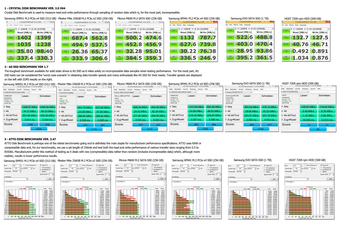 Test Platform: EUROCOM M5 Pro; 15.6" FDP IPS eDP Intel Core i7-4720HQ; Nvidia GTX 980M 16GB (2x 8GB DDR3-1866 1.35V Corsair) Storage: 1TB 2.5" Samsung 850 PRO; SATA3 256GB M.2 Plextor PCIe x2 256GB M.2 Samsung XP941 PCIe x4 512GB M.2 Samsung SMP51 PCIe x4 256GB M.2 Micron M600; SATA3 500GB 2.5" Hitachi 7200rpm HDD |